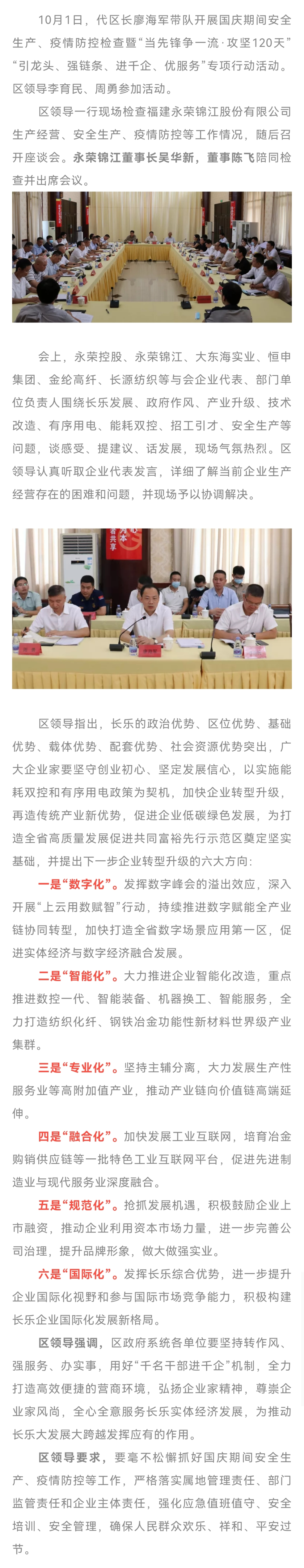 区领导莅临永荣锦江开展国庆期间安全生产、疫情防控检查活动
