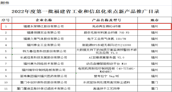 近日,省工信厅门户网站发布,根据《福建省工业和信息化重点新产品征集和发布工作实施细则》(闽经信政法〔2018〕177号)的要求,2022年度第一批福建省工业和信息化重点新产品经组织申报、初审、专家评审、综合评议等程序,并通过会议研究,拟将免染再生锦纶6纤维等39项新产品列入2022年度第一批福建省工业和信息化重点新产品推广目录。永荣股份申报的新品——免染再生锦纶6纤维入选。