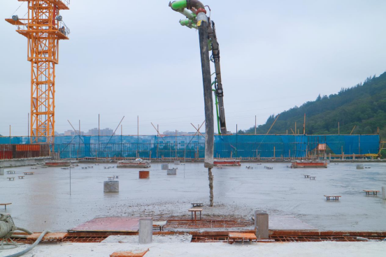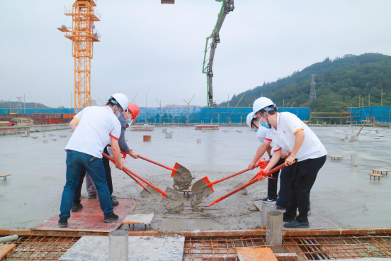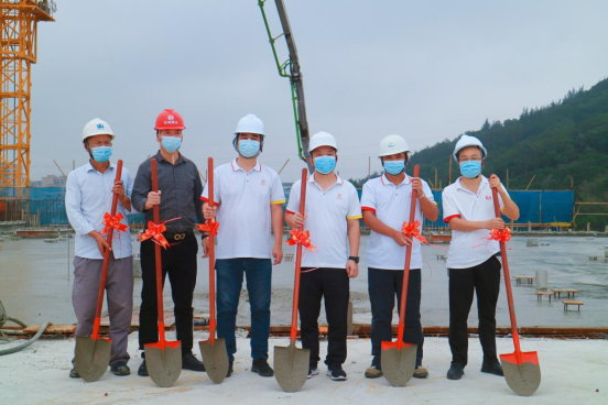 上午11时许,众人拿起铁锹,共同浇筑楼顶最后一方混凝土。随着这最后一方混凝土的浇筑成功,项目封顶仪式顺利完成。