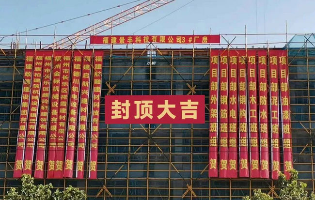 11月13日上午,当福州冬日里遇上了难得的暖阳,这预示着今天是个好日子。永荣股份景丰科技有限公司纺丝二期项目施工现场气氛热闹纷繁,耸立的厂房主体被一条条红色祝福标语装点得格外喜庆,工人们脸上洋溢着喜悦的神色,今天这里即将隆重举行景丰纺丝二期工程封顶仪式。