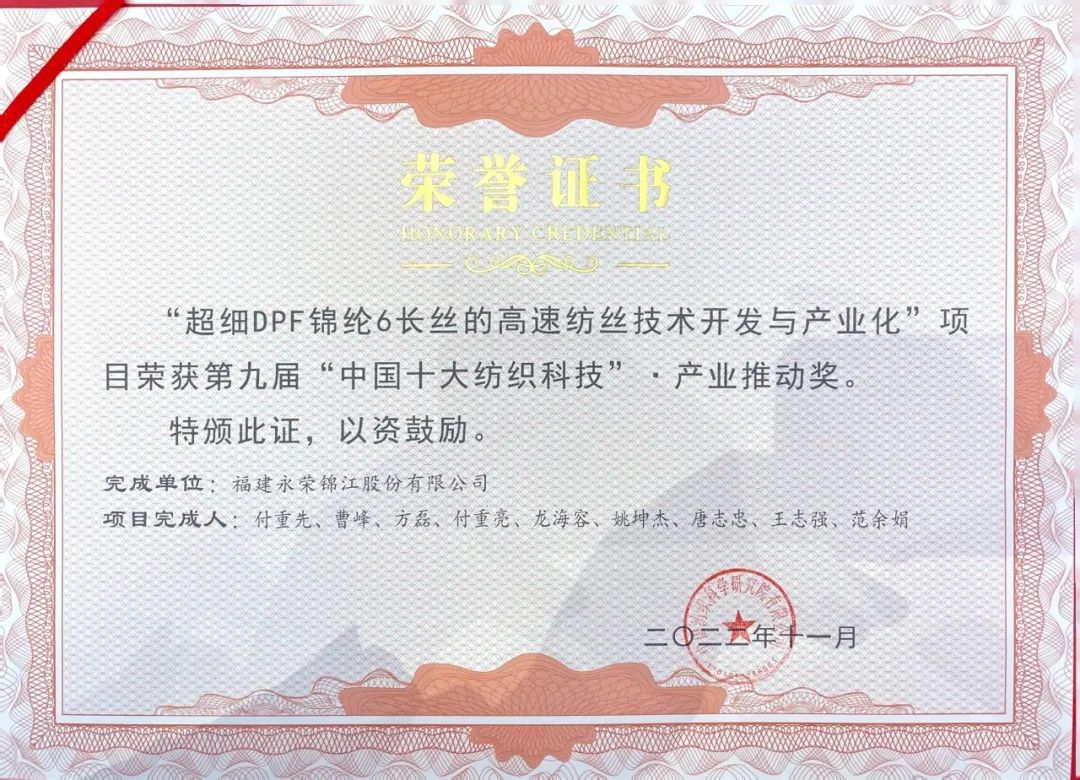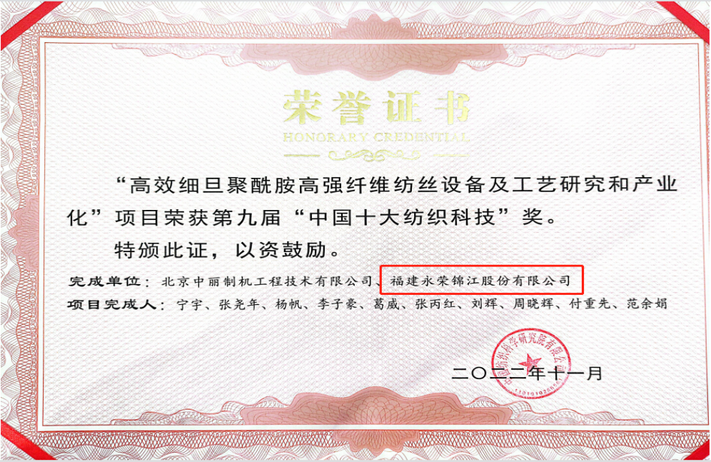 2月20日,在泉州晋江召开的2022中国纺织科技成果对接峰会暨第九届“中国十大纺织科技”发布会上,永荣股份申报的“超细DPF锦纶6长丝的高速纺丝技术开发与产业化”项目以及与北京中丽制机工程技术有限会司联合申报的“高效细旦聚酰胺高强纤维纺丝设备及工艺研究和产业化”项目分别荣获“中国十大纺织科技·产业推动奖”和“中国十大纺织科技”主奖。据悉,这是永荣股份连续第三次荣获中国十大纺织科技奖项。