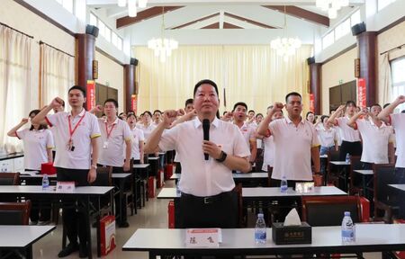 会议在神圣的国歌声中拉开序幕。在党委书记陈飞的带领下,全体党员紧握右拳,再次庄严宣誓“我志愿加入中国共产党……随时准备为党和人民牺牲一切,永不叛党。”他们满怀激情,声音铿锵,字字豪迈,更加坚定了党员们的入党初心。宣誓结束后,由党委领导分别为14名优秀共产党员及4位优秀党务工作者颁发“荣誉证书”及奖金,进一步增强新党员的责任感和使命感,听党话,跟党走,在社会建设中担当作为,时刻展现党员风采。同时也彰显了永荣股份共产党人努力工作,不忘初心、牢记使命的决心和对党的忠诚热爱之情。