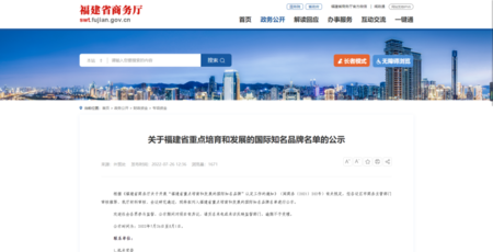 “福建省重点培育和发展的国际知名品牌”的认定,是为推进“十四五”时期外贸高质量发展,深入实施对外贸易“优进优出”战略,支持福建省企业加快培育自主品牌,提升竞争力,促进外贸转型升级、提质增效,福建省商务厅组织开展了福建省重点培育和发展的国际知名品牌认定工作。