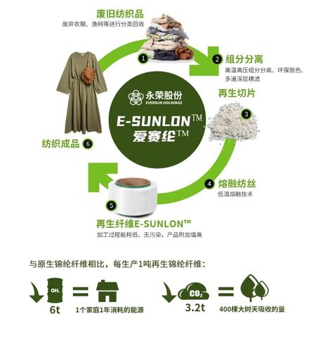 永荣股份作为国内民用锦纶行业的龙头企业,将于中国国际纺织纱线(秋冬)展览会期间,携其全新研发成果——消费后再生锦纶纤维E-SUNLON?爱赛纶正式亮相。E-SUNLON?颠覆传统纤维原料来源,整合利用废弃资源,与原生纤维相差无几,实现了绿色、循环与高利用率的统一。开发前期,主要采用废旧服装面料为原料,经全新增压技术脱色+组分分离等一系列步骤,实现再生材料高精技术的突破,形成从废旧纺织品—消费后再生切片——消费后再生纤维——纺织成品的“绿色闭环”。