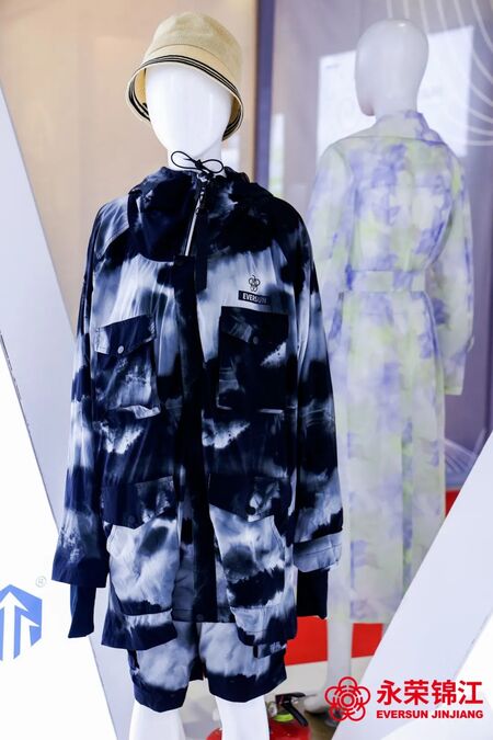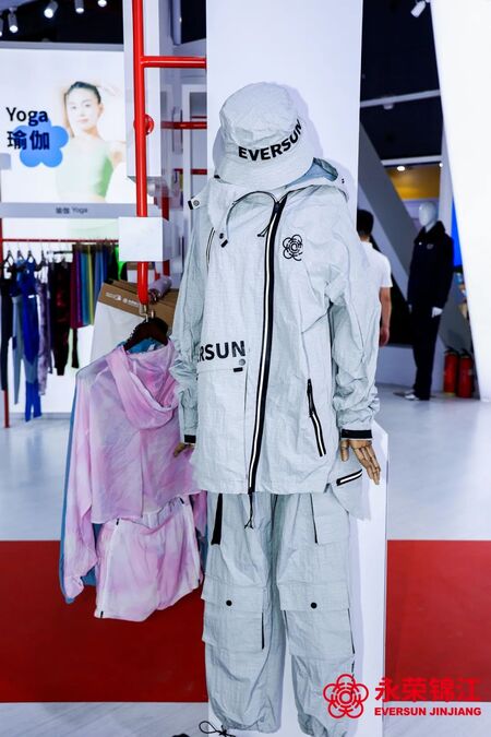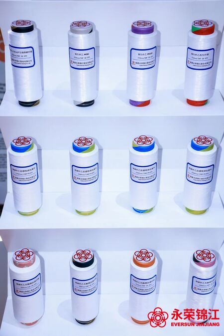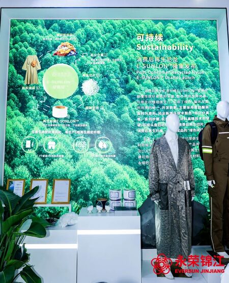 在本次展会中,永荣股份向全行业重点推介了全新研发成果——消费后再生锦纶纤维E-SUNLON?爱赛纶。产品主要以废旧服装面料为原料,经全新增压技术脱色+组分分离等一系列步骤,实现再生材料高精技术的突破,形成了从废旧纺织品—消费后再生切片——消费后再生纤维——纺织成品的“绿色闭环”。目前,E-SUNLON?爱赛纶已获得全球回收利用规范的GRS认证、EPD环境产品声明认证及LCA生命周期评价。