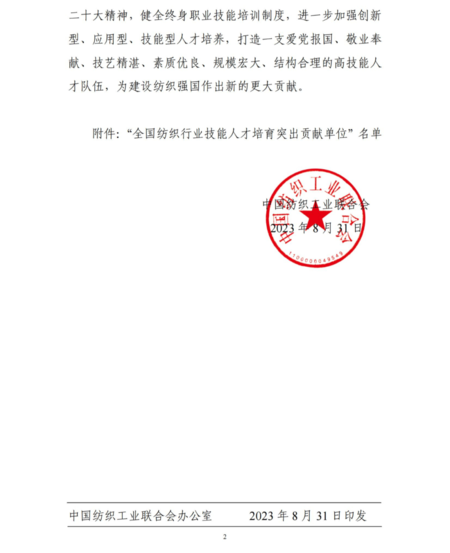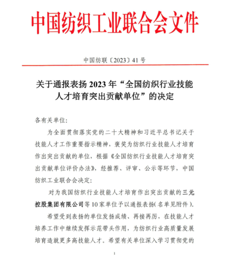 近日,中国纺织工业联合会发布关于通报表扬2023 年“全国纺织行业技能人才培育突出贡献单位”的决定,对为我国纺织行业技能人才培育作出突出贡献的10家单位予以通报表扬。