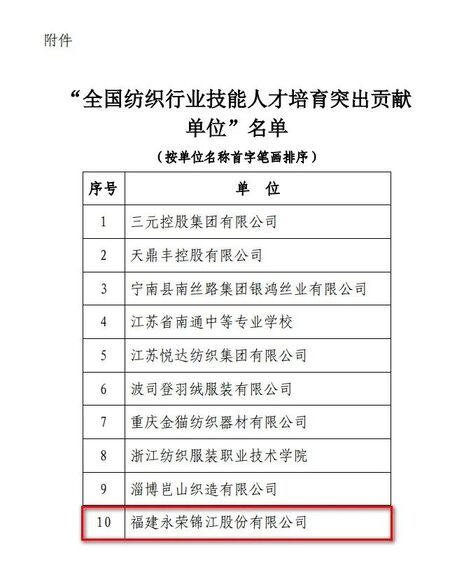 福建永荣锦江股份有限公司作为全国纺织行业技能人才培育突出贡献单位获得表扬。