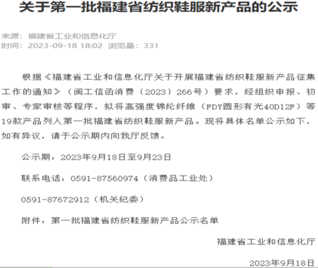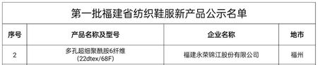 近日,根据《福建省工业和信息化厅关于开展福建省纺织鞋服新产品征集工作的通知》(闽工信函消费〔2023〕266号)要求,经组织申报、初审、专家审核等程序,共计筛选19款产品列入第一批福建省纺织鞋服新产品。我司申报的新品——多孔超细聚酰胺6纤维入选。