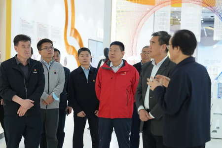 在数字展厅的门口,汪建根总经理与来访人员一一握手致以热烈的欢迎。交流活动的第一站在此拉开序幕,展厅内具体地展现了永荣在科技创新、产品研发、绿色环保等方面的显著成就。