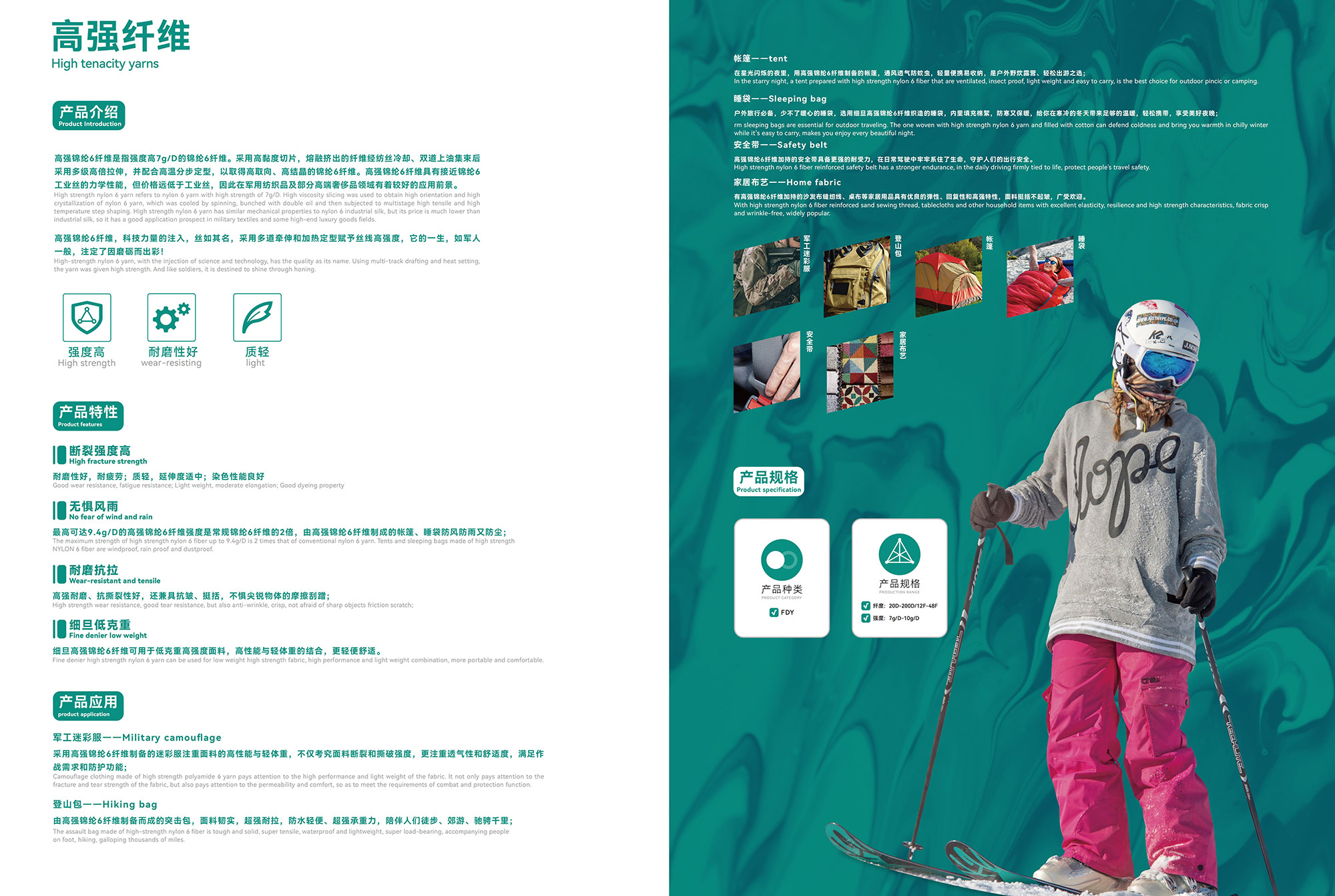 高强锦纶6纤维,科技力量的注入,丝如其名,采用多道牵伸和加热定型赋予丝线高强度,它的一生,如军人 一般,注定了因磨砺而出彩!