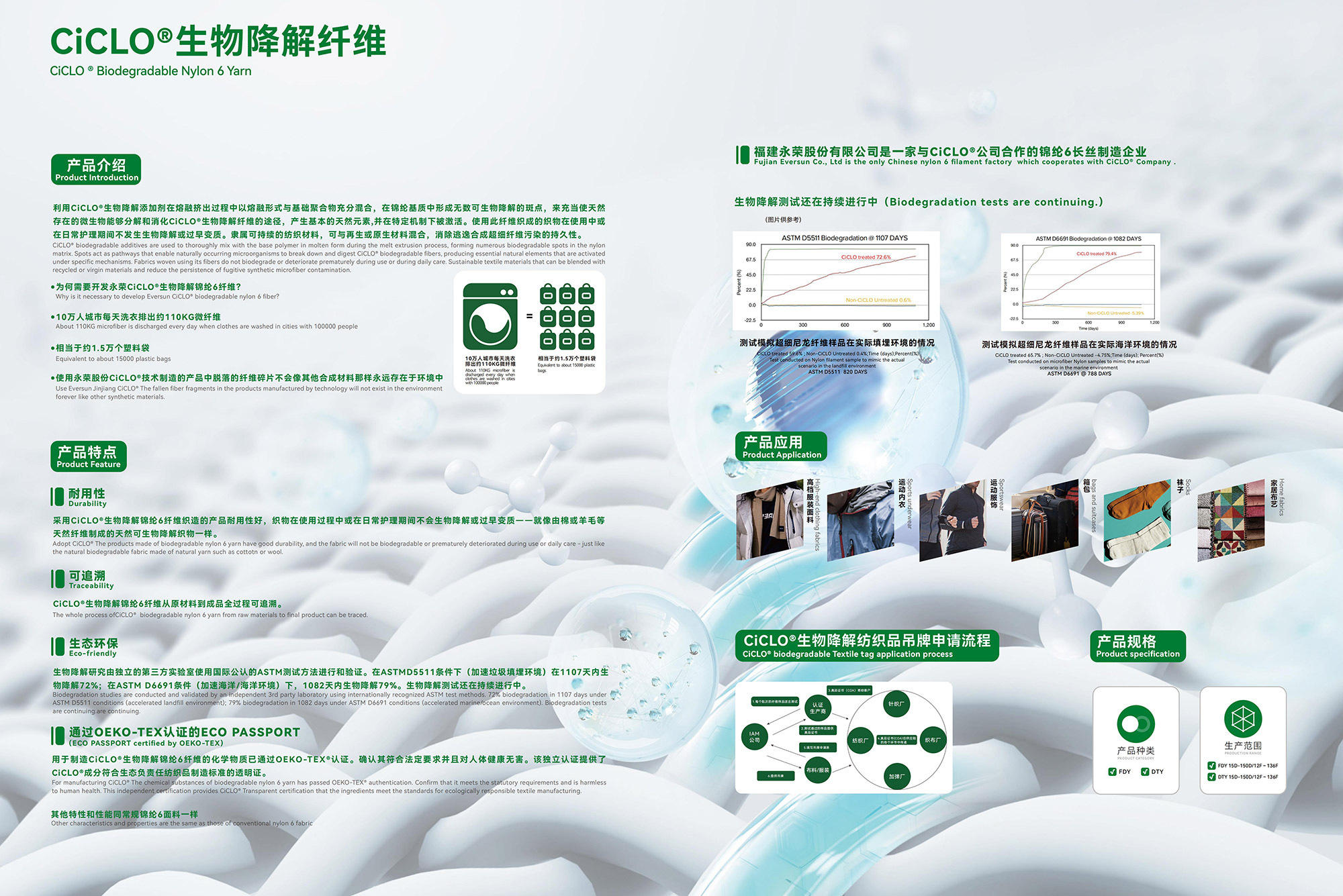 利用CiCLO?生物降解添加剂在熔融挤出过程中以熔融形式与基础聚合物充分混合,在锦纶基质中形成无数可生物降解的斑点,来充当使天然 存在的微生物能够分解和消化CiCLO?生物降解纤维的途径,产生基本的天然元素,并在特定机制下被激活。使用此纤维织成的织物在使用中或 在日常护理期间不发生生物降解或过早变质。隶属可持续的纺织材料,可与再生或原生材料混合,消除逃逸合成超细纤维污染的持久性。